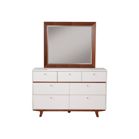 Give your bedroom a stylish and modern, mid-century feel with this clean lined collection. The Dakota 7 drawer dresser is structurally sound and constructed with Mahogany wood solids & veneer in a white finish and trendy acorn brown accents. The Dakota collection hints at subtle refinement, without overpowering your current decor. Drawers feature English Dovetail Drawer Construction, felt lined top drawer to protect your valuables as well as metal ball bearing drawer glides The pieces in the Alpine Furniture Dakota collection fluidly fits in with a variety of aesthetics and color schemes to compliment your bedroom setting. Coordinate with other pieces from the Dakota bedroom collection.
