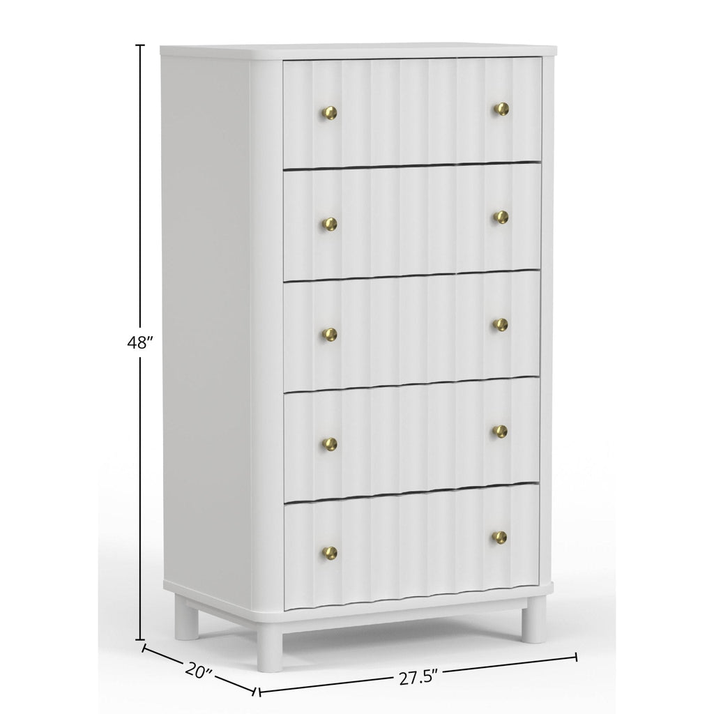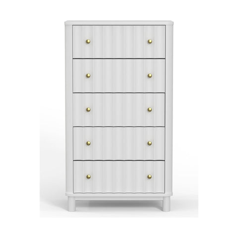 Stapleton is a timeless and versatile design that provides a perfect complement to your bedroom. Handcrafted in Indonesia from Mahogany Solids and Veneers, the beautiful white finish works with a variety of décor options. Sturdy construction means your furniture will be durable and last for years. The 5 Drawer Chest completes your bedroom. With 5 spacious drawers, there is plenty of room to store your clothes. The top drawer is felt lined to protect your personal items. The scalloped motif on the drawer fronts is distinctive and the brass hardware helps set it apart. The piece ships fully assembled.
